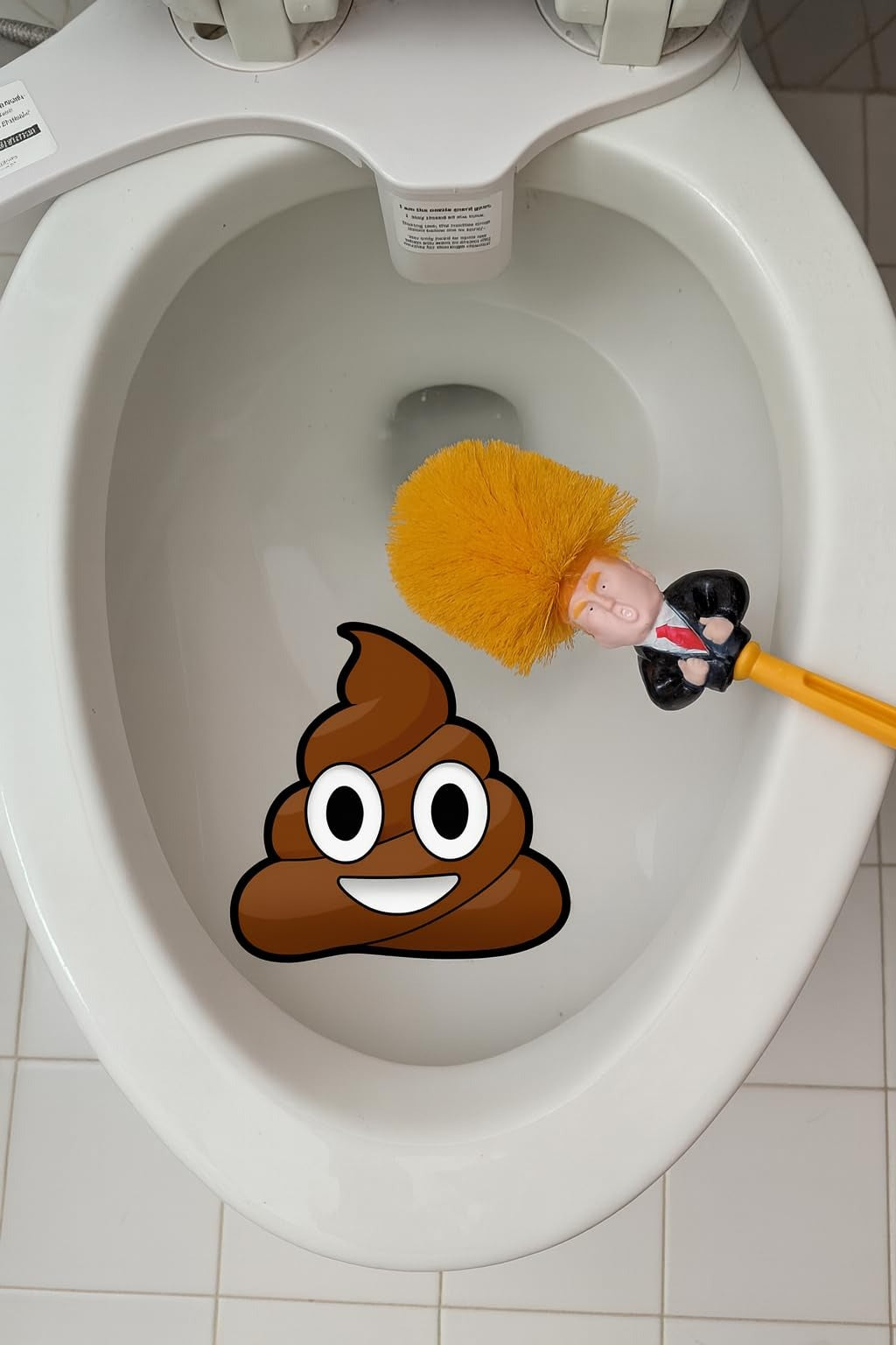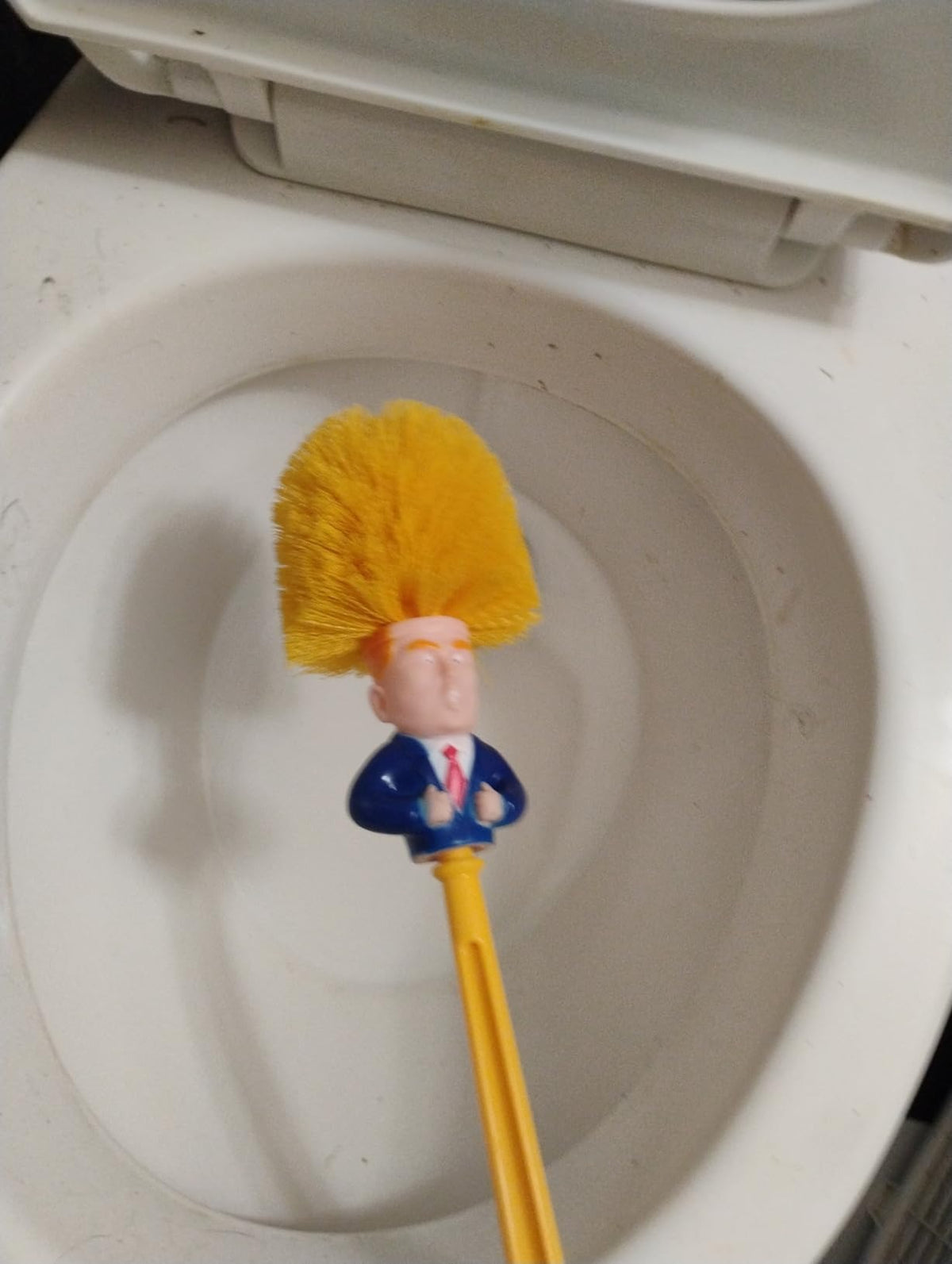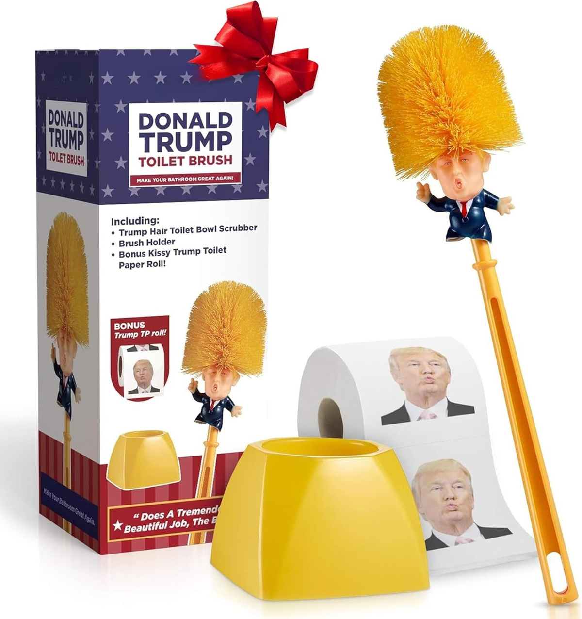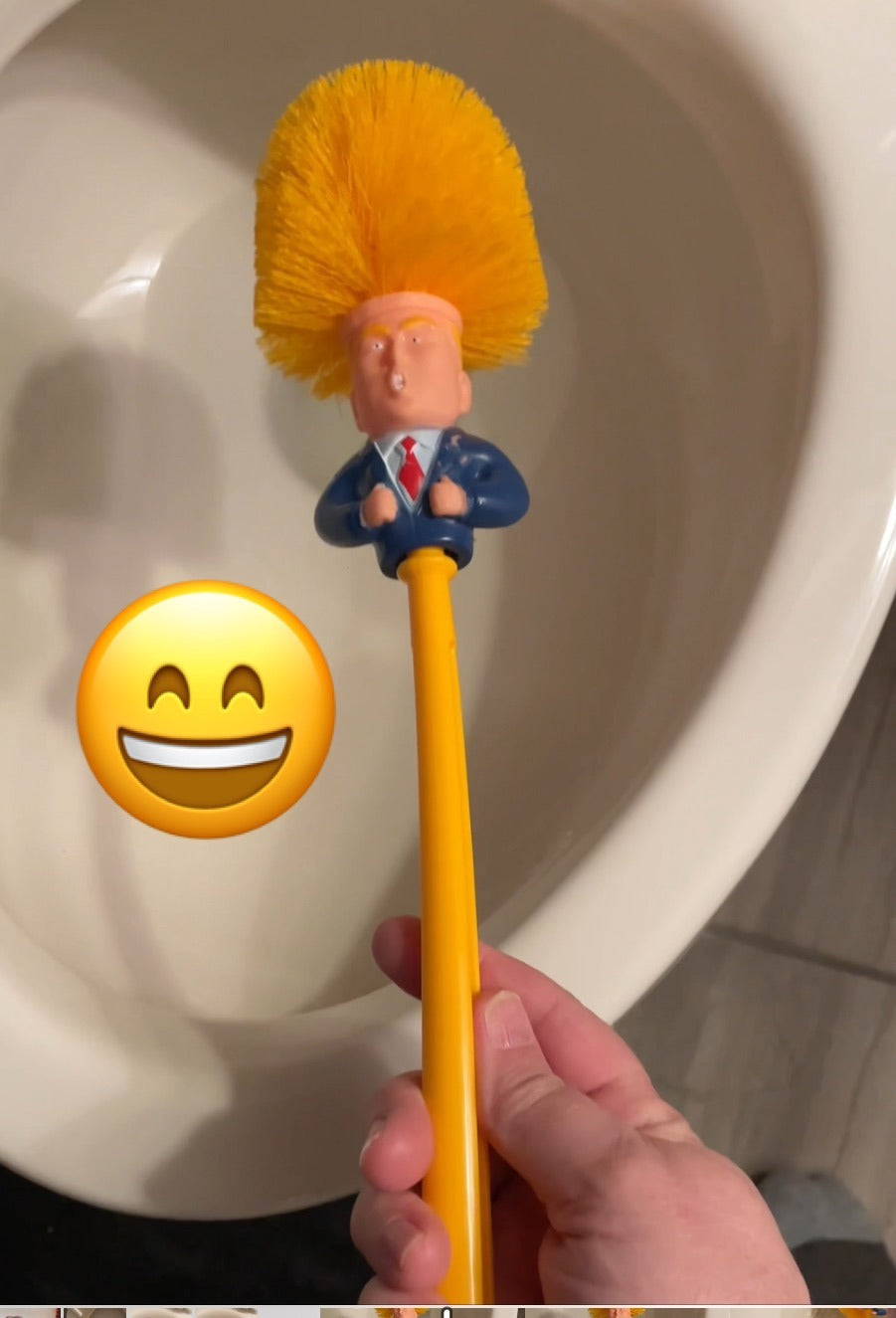 His hair IS the bristles. Unlike regular toilet brushes, this one puts Trump's head straight into your toilet bowl with his hair doing all the scrubbing. The best part? Everyone finds it hilarious - whether you love him or hate him, this brush brings laughter to both sides.